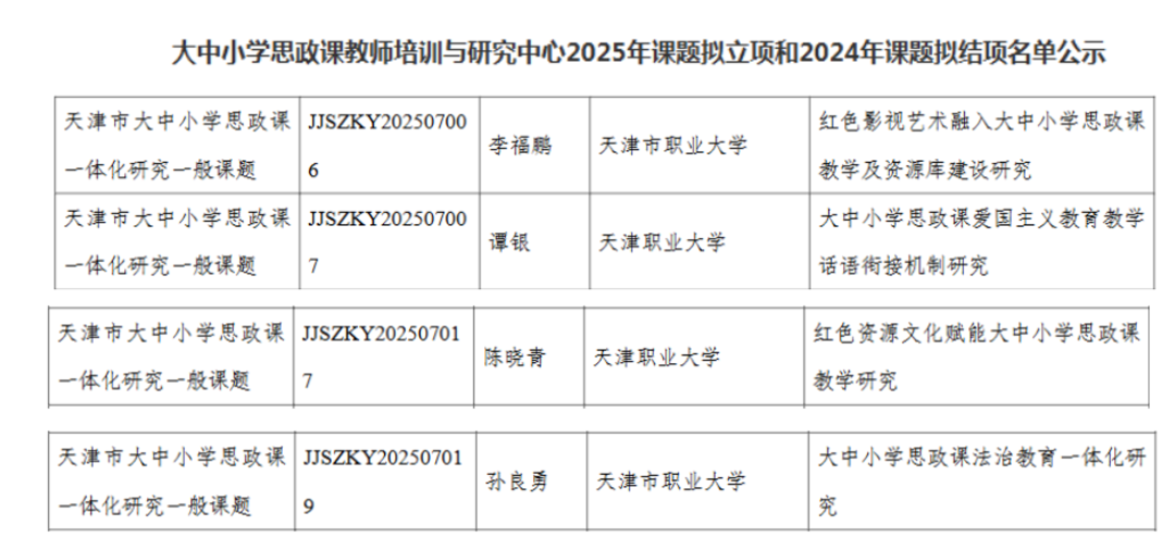 2025年9月12日—25日,天津市各思想政治理论课常设项目承办单位陆续发布2025年度天津市思想政治理论课常设课题立项公示,我校马克思主义学院李福鹏、谭银、陈晓青、孙良勇、李宝佳、魏丽华、邵芳菲、郭瑢8位教师申报的课题获批立项。